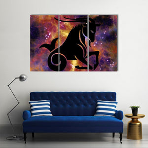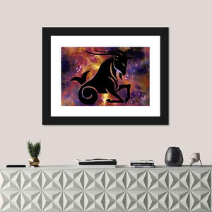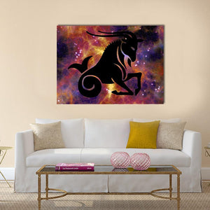 Sign Of Capricorn Canvas Wall Art shows a centered, silhouetted Capricorn figure with a swirling tail set against a starry nebula in bold black, purple, orange and yellow — the result is a mystical, cosmic mood. Its modern, graphic look creates a strong focal point for modern interiors and astrology-themed spaces.