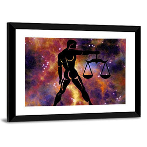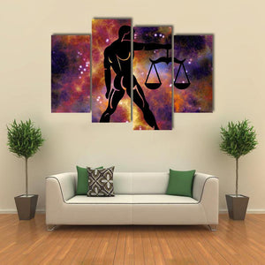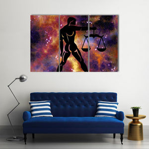 This Libra canvas centers a silhouette of a person holding scales against a galaxy background. Black, orange, purple, yellow and white create a cosmic, symbolic, mystical atmosphere. Suited to modern, abstract interiors or astrology-themed rooms.