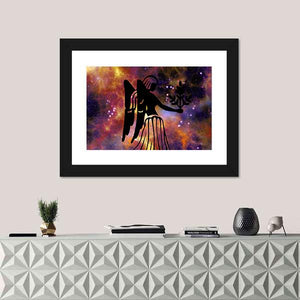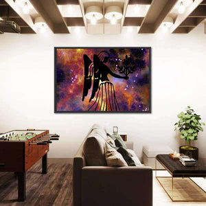 Sign Of Virgo Canvas Wall Art shows a centered silhouette of a winged figure holding a branch against a starry galaxy background. Rendered in purple, orange, yellow and black with a modern, abstract feel, the piece gives a mystical, cosmic, ethereal mood. It suits contemporary or astrology-themed room decor.