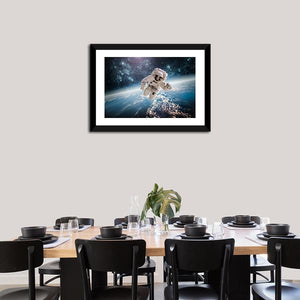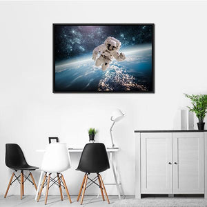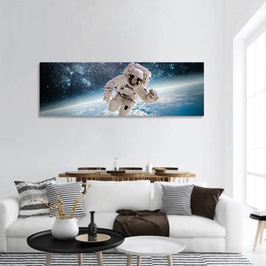 This panoramic canvas features an astronaut floating above the curved edge of Earth, with stars and deep blues, blacks, whites, and greys creating a sense of depth. The scene feels vast and serene, with a modern, contemplative mood. It suits modern living rooms and home offices that favor clean, contemporary wall art.