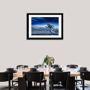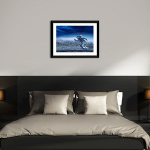 This canvas wall art features an astronaut in mid-stride on an alien planet, surrounded by a captivating landscape. The blue and grey palette evokes a sense of adventure and awe, perfect for sparking conversation and inspiration in your space.