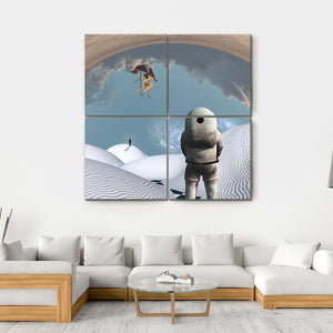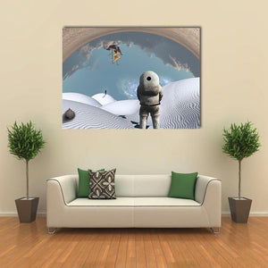 This striking canvas art features an astronaut in a surreal alien landscape, surrounded by wavy sand dunes and a vast, curved horizon. With hints of a creature with golden wings and a spiral galaxy above, it creates a mysterious atmosphere that draws viewers in.