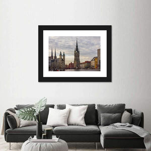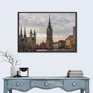 Square Market Of Halle shows a historic town square with tall spired buildings and a tower, captured in a realistic, photographic style. Muted greys and browns with touches of red and blue and a cloudy sky give the scene a quiet, overcast urban mood. The image works well with modern room decor.