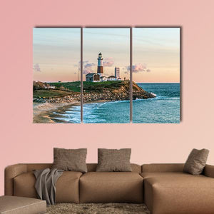 Montauk Lighthouse Canvas Wall Art shows a striped lighthouse on a rocky coastline at sunset, with gentle waves and scattered clouds. The realistic landscape uses blues and whites with touches of red, tan, and yellow to create a serene, tranquil scene. It suits coastal or modern rooms as a calm, scenic accent.