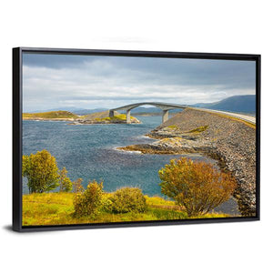Experience the serene beauty of Norway with this captivating canvas wall art. Featuring a striking arched bridge over tranquil waters and rocky islands, it's a modern piece that adds depth and drama to your space.