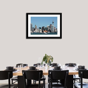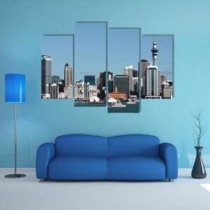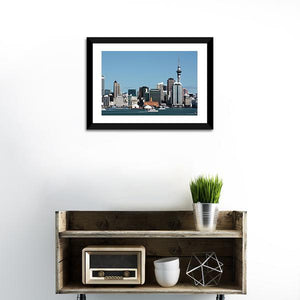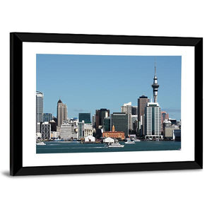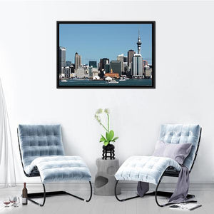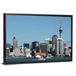 This vibrant canvas art captures the bustling skyline of Auckland, featuring its iconic Sky Tower against a bright blue sky. The lively portrayal of tall buildings and boats in the harbor brings a dynamic urban feel to your space.