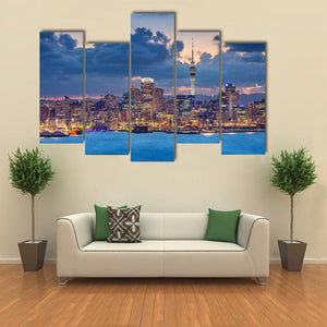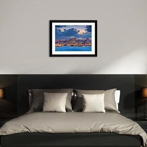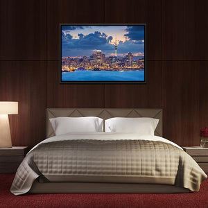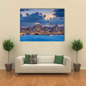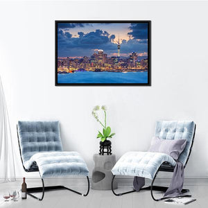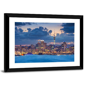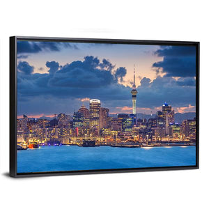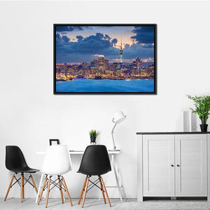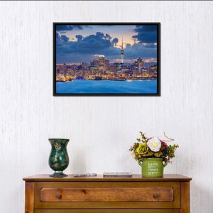 Auckland’s waterfront skyline at twilight, captured in a photorealistic print with a tall lattice tower, illuminated buildings, and looming dark clouds. The blue, yellow, gray, and white palette gives a vibrant, urban mood. Works well in modern living rooms, home offices, or any space that needs cityscape wall decor.