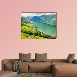 Experience the serene beauty of Norway with our Aurland Valley & Fjords Canvas Wall Art. This piece captures a tranquil landscape featuring majestic fjords, green hills, and a shimmering lake, framed by snow-capped mountains and a small village nestled along the shore.