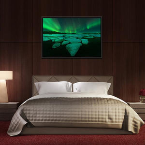 Experience the mesmerizing beauty of the aurora borealis with this canvas wall art featuring Iceland's magical night sky. Depicting vibrant greens against a deep black backdrop and jagged ice formations, it creates a serene atmosphere perfect for calming spaces.