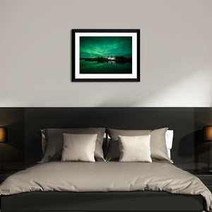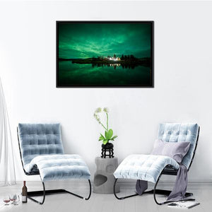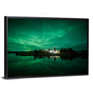 Aurora Borealis Iceland Panoramic Canvas depicts a lakeside scene with houses, trees and a reflective lake beneath green northern lights. Cloudy skies and dramatic lighting create a serene, mystical mood; lit windows add a quiet, lived-in detail that suits modern room decor.