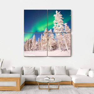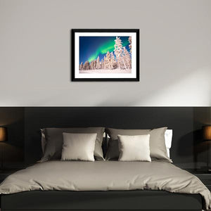 This canvas wall art captures the breathtaking aurora borealis dancing above snow-covered trees in Lapland, Finland. The serene blues and greens create a magical atmosphere, perfect for bringing a sense of wonder into your home.