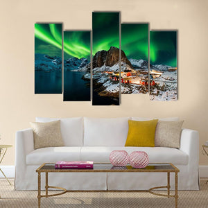 Aurora Borealis Over Harmony Norway Canvas Wall Art shows the northern lights dancing over a snow-covered village, mountains, and a reflective lake. Rendered in a realistic style, the scene feels magical and serene, with green aurora lights and red houses under a cold winter night sky. Suits modern or nature-inspired rooms that want a calm, scenic focal piece.