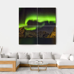 Experience the mystical beauty of the aurora borealis over the serene landscapes of Norway. This artwork captures the dramatic dance of green and yellow lights against a backdrop of snow-capped mountains and a starry night sky, creating an awe-inspiring atmosphere.