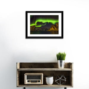 This canvas art captures the magical aurora borealis over the serene Lofoten Islands. Featuring snow-capped mountains and a calm lake reflecting the vibrant green and blue lights, it brings a touch of nature's awe to your space.