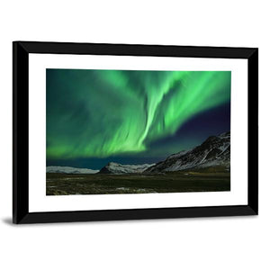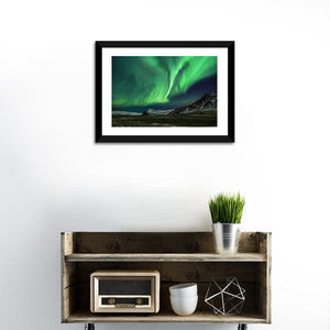 This captivating canvas art showcases the awe-inspiring aurora borealis over majestic, snowy mountains. The vibrant green waves of the aurora contrast beautifully with the dark, star-filled sky, creating a magical and serene atmosphere.