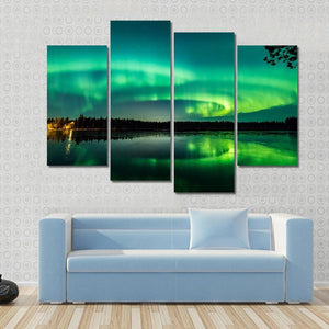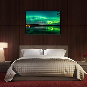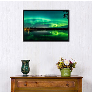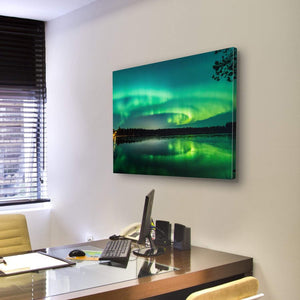 Experience the enchanting beauty of the aurora borealis reflected over a serene Finnish lake. This captivating canvas wall art evokes a magical atmosphere, perfect for nature lovers and anyone seeking a peaceful ambiance in their space.