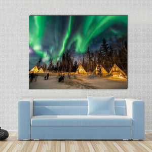 Experience the serenity of a snowy landscape under the mesmerizing aurora borealis. This piece features glowing tipis nestled among bare trees, evoking a magical winter night. It complements modern and nature-inspired decor beautifully.