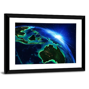 Earth from space captured over Australia and Indonesia at night, showing glowing outlines of Australia and Tasmania, clusters of yellow city lights, and a sunburst on the horizon. The realistic, cosmic scene uses deep blues, greens and black for a serene, awe-inspiring mood that suits modern living rooms and offices.