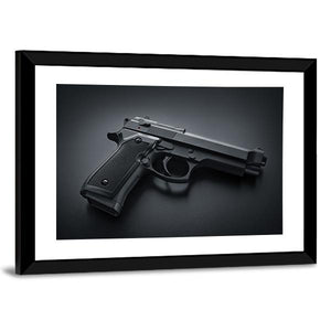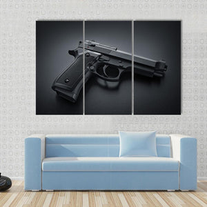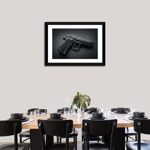 This striking canvas features a close-up view of a handgun, presented in a serious and dark tone. The photorealistic style and detailed textures create a captivating piece that fits well in modern decor.