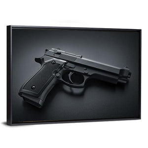 A close-up, photorealistic canvas print of an automatic pistol, shown in stark black, grey, and white tones to convey a serious, modern mood. The minimalist composition and metallic details fit well in modern, minimalist, or military‑inspired interiors looking for bold, understated wall decor.