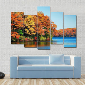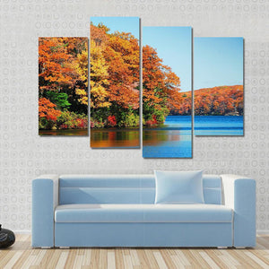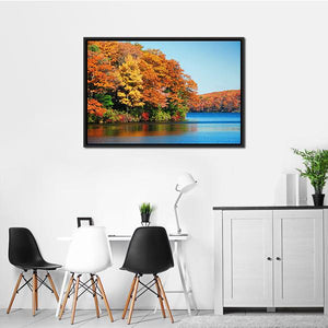 This canvas wall art captures the serene beauty of fall foliage reflecting over a tranquil lake. The vibrant palette of orange, yellow, and blue evokes the calm and warmth of autumn, making it an inviting addition to any space.