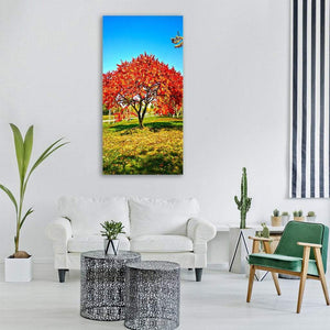This photorealistic canvas captures a centered, eye-level view of a tree dressed in autumn foliage against a clear sky. Shadows fall across the grass and the red, orange, green, blue and yellow palette feels vibrant yet serene. It works well in modern or nature-inspired rooms as a calm focal point.