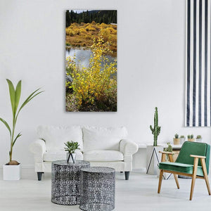 A serene autumnal forest scene featuring vibrant yellow leaves and a calm river, composed using the rule of thirds. The natural palette of yellow, green, brown and blue creates a peaceful, reflective mood that suits modern or nature-inspired rooms.