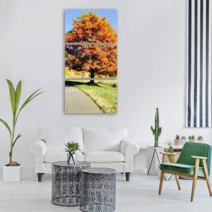 A realistic landscape of a tree-lined path and open field, alive with fall foliage in warm oranges, yellows and greens that creates a vibrant, peaceful autumnal mood. This canvas print works well in living rooms, entryways, or any room that needs nature-focused wall decor.