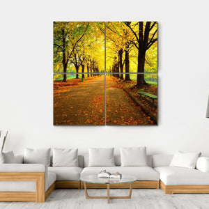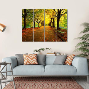 This landscape captures a serene pathway through a city park in autumn. Rustling leaves in warm shades of gold, brown, and orange invite you to enjoy a peaceful moment under the sunlight filtering through the trees. It’s a wonderful addition to your home décor, bringing a touch of nature's beauty indoors.