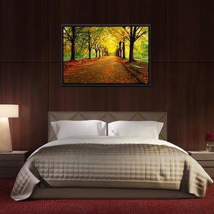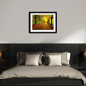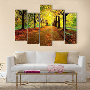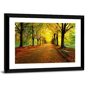 Autumn In City Park shows a tree-lined path and a quiet park bench beneath yellow and orange leaves. Sunlight filters through the trees, and scattered leaves with converging lines draw the eye down the path, creating a peaceful, vibrant autumnal scene that works well in modern or nature-inspired rooms.
