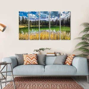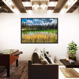 This landscape artwork captures a tranquil lake surrounded by mountains, forests, and delicate grasses. The serene autumn palette of greens, blues, and yellows evokes a peaceful atmosphere, making it a perfect addition to any nature-inspired space.