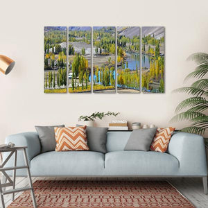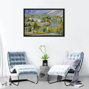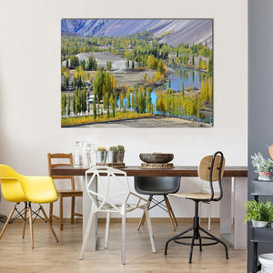 This captivating landscape artwork features a serene lake surrounded by autumnal trees, a winding river, and majestic mountains. The realistic depiction evokes a peaceful atmosphere, perfect for any nature lover looking to enhance their decor.