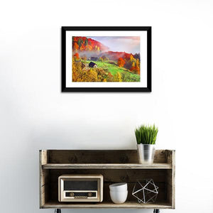 This canvas art captures a serene autumn landscape in Ukraine, showcasing a vibrant palette of orange, red, and green. Clusters of trees with stunning foliage and quaint houses nestled on a hillside create a peaceful and picturesque scene, inviting warmth and nature into your space.