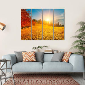 This canvas art captures the serene beauty of autumn in Ukraine. Featuring tall red trees and a gentle grassy hill, the warm palette of oranges and yellows evokes a vibrant sunset feel. It's an inviting addition to any space.