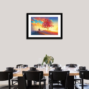 This canvas art captures a solitary tree silhouetted against a vibrant sunset. The warm hues of orange and red create a serene and hopeful atmosphere, making it an ideal addition to your wall decor.