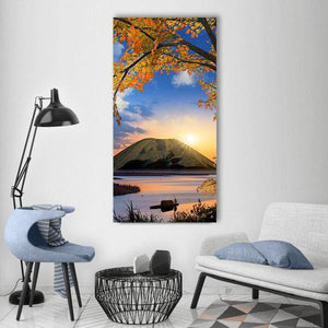 A mountain and lake at sunset, framed by autumn trees and glowing in warm oranges, yellows, and deep blues. The realistic, scenic image feels serene and peaceful, suited to modern or nature-inspired interiors.
