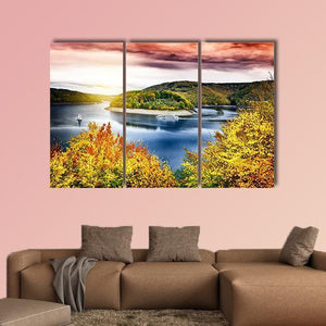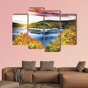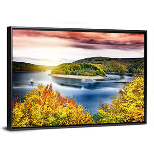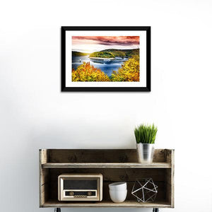 This autumn landscape shows a river with a sailing boat, trees in autumn foliage, rolling hills and a dramatic sunset sky. The realistic, vibrant scene feels serene and peaceful, with blues, greens, warm yellows, oranges and pinks. It works well in modern or nature-inspired interiors as a calm, colorful focal point.