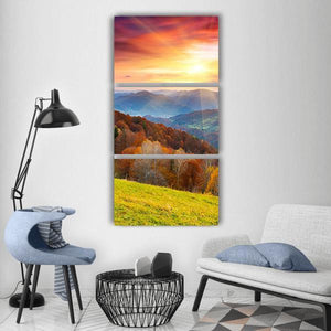 Colorful Mountain At Sunset Canvas shows mountains and a forest beneath an autumn sunset, with sun rays adding depth and framing. The orange, yellow, green, blue and brown palette creates a vibrant, serene, majestic atmosphere. Its modern landscape style suits nature-inspired or contemporary rooms.