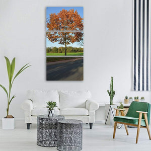 This canvas depicts a tree beside a quiet road through a field, with orange foliage and soft shadows that create an autumnal calm. The realistic landscape and warm palette suit modern or nature-inspired décor.