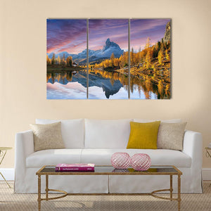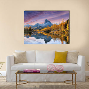 Autumn Lake Federa in Dolomites depicts a mountain lake bordered by vibrant autumn trees and snow-capped peaks, with a streaked sunset sky reflected on the water. The realistic scene uses blue, purple, orange, yellow, and white to create a calm, majestic, and atmospheric mood. A colorful nature print that fits well in modern living room decor or an entryway.