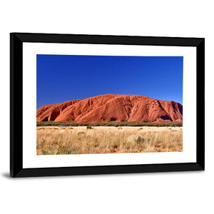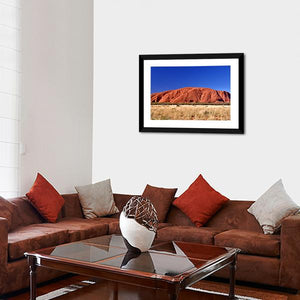 Ayers Rock (Uluru) fills this panoramic canvas, showing the red rock formation and dry grass beneath a clear blue sky. The realistic nature-photography look and warm reds and oranges create a majestic, serene sense of scale that fits modern and nature-inspired interiors.