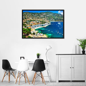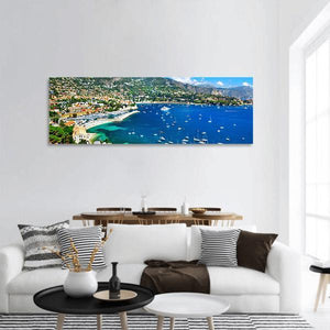 Azzure Coast of France Panoramic Canvas Wall Art shows a sunny coastal town with sailboats docked in a calm harbor and buildings cascading down a green hillside. Photographic realism and a blue-green palette create a vibrant, peaceful mood. Suits coastal or modern room decor.