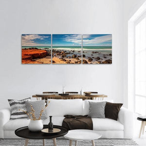 Red Dirt At Baby Beach Panoramic Canvas Wall Art presents a wide panoramic nature photograph of a beach scene with ocean, rocks, and open sky. Red rock formations and long-exposure water blend with blues, greens, oranges and browns to create a serene, natural mood. It works well in coastal or modern room decor that favors nature photography.