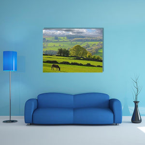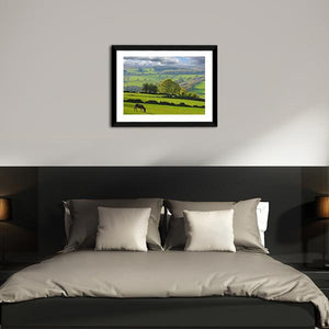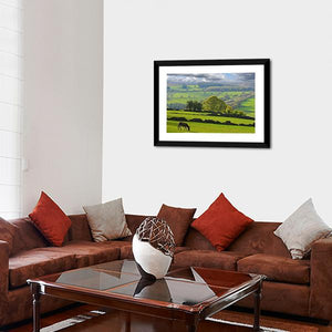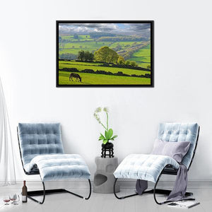 This calming canvas features a baby donkey grazing peacefully in a serene landscape. Surrounded by lush green rolling hills, a rustic stone wall, and a sky dotted with fluffy clouds, it invites a touch of nature into your space.