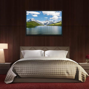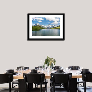 Bachalpsee Lake, Switzerland, shown in a photorealistic mountain lake scene with snow-capped peaks and green hills. Clear blue sky, white clouds and a reflective lake surface create a calm, serene mood. Suited to modern room decor or quiet areas of the home.