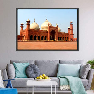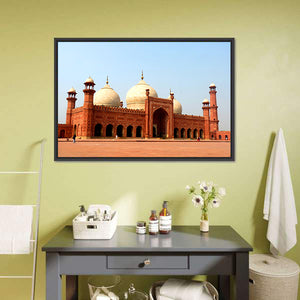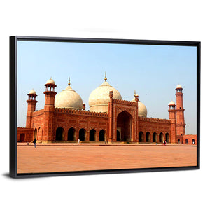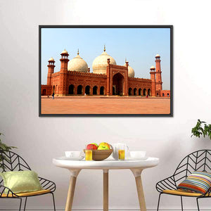 This canvas art beautifully captures the Badshahi Mosque in Lahore, showcasing its majestic minarets, domes, and arches against a clear blue sky. The serene palette of red, white, and orange creates a grand atmosphere, making it a striking addition to your wall decor.