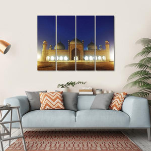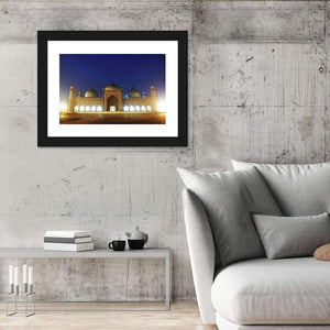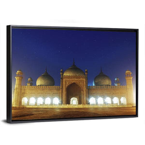 This canvas artwork captures the Badshahi Mosque in Lahore, showcasing its majestic domes and minarets against a serene night sky. The rich blue and gold palette invites a sense of history and tranquility, making it a captivating addition to your wall decor.