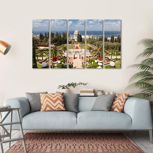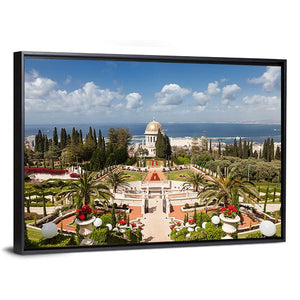 This canvas art captures the serene beauty of the Bahai Gardens in Israel, showcasing symmetrical gardens, a domed building, and vibrant greenery. It brings a peaceful and majestic atmosphere to any space.