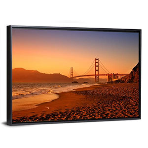 Bridge on Baker Beach captures the Golden Gate Bridge at sunset, with warm orange and yellow light spilling over distant mountains and waves crashing on a pebble beach. The realistic panoramic scene feels serene and picturesque, a calm focal point for coastal or modern rooms.