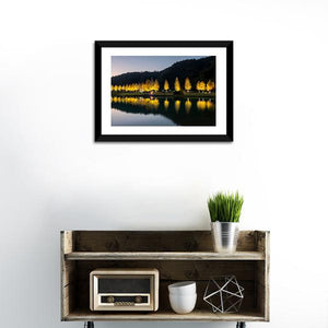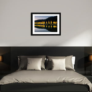Bald cypress trees are lit by spotlights in a panoramic night scene, their conical forms mirrored in calm water. The yellow, black and blue palette gives the scene a serene, slightly magical mood. Its modern panoramic style complements contemporary interiors and serves as a quiet focal point.